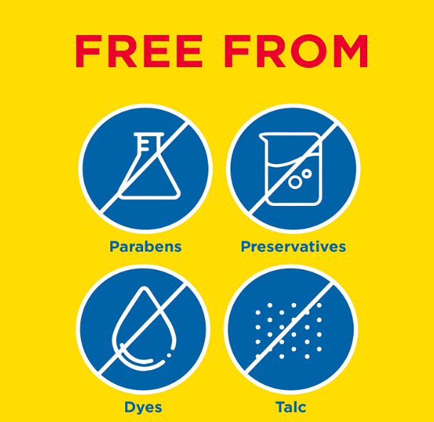 - FREE FROM: dyes, preservatives, parabens, and talc