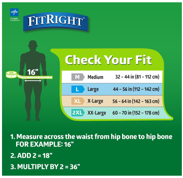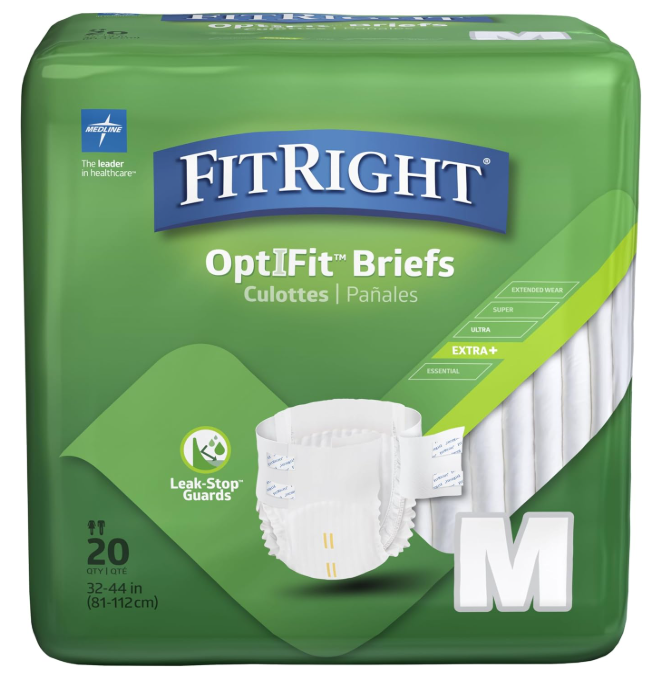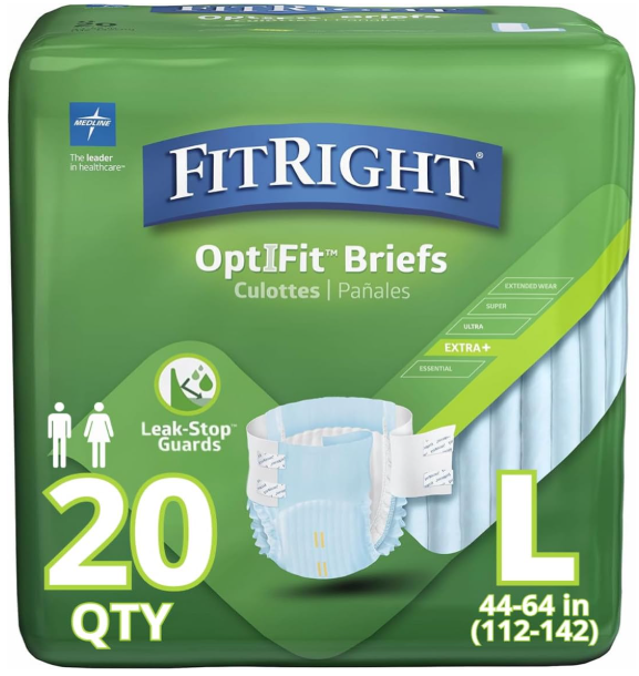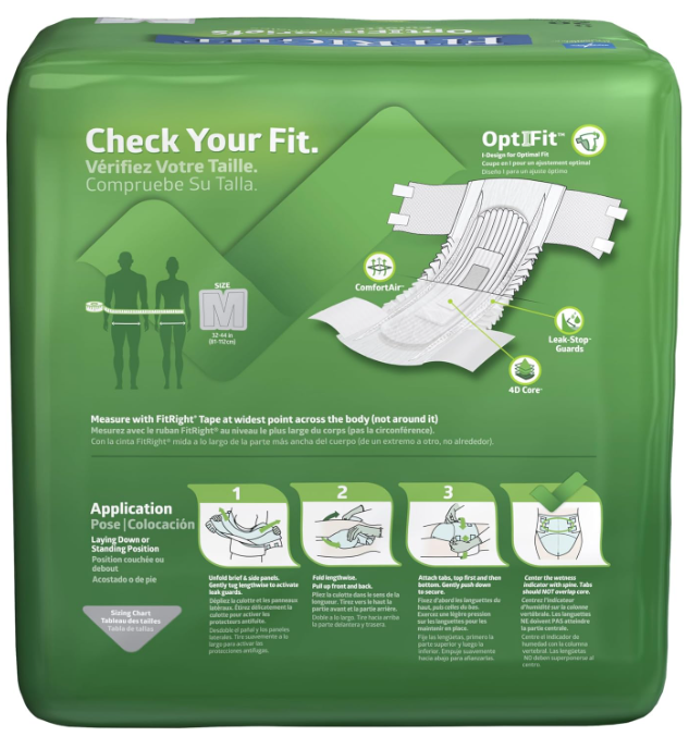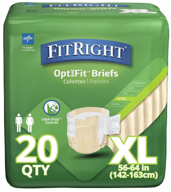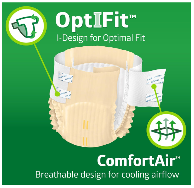 FitRight OptiFit Extra+ Adult Diapers with tabs provide reliable wetness protection while supporting skin health and comfort. The patented 4D-Core locks in moisture to keep skin dry and reduce the risk of irritation. Made with soft, cloth-like material for added comfort, these incontinence briefs offer a better fit, excellent odor control, and a discreet, less bulky design. Proudly made in the USA.