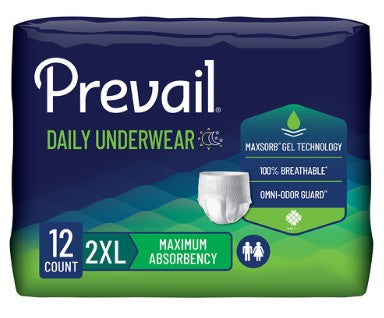 Prevail® Underwear fits a wide range of wearers and with Silky-Soft™ outer fabric is softer and even more comfortable for the wearer. Prevail® Underwear is so soft you have to Feel the Difference. Prevail Underwear Extra Absorbency is available in five sizes; Small, Medium, Large, Extra Large and 2X Large, and Prevail Super Plus Underwear—designed for nighttime and extended use—and is available in Medium and Large sizes.