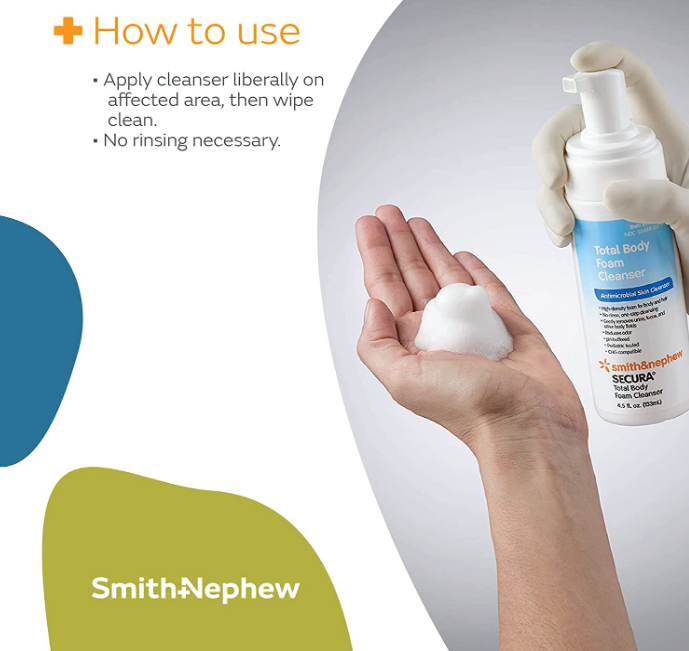 Maintain hygiene without taking a shower or bath with Smith & Nephew Total Body Foam Cleanser. It produces thick, dense suds that thoroughly cleanse the hair and scalp, as well as other body areas Secura™ total body foam cleanser is also anti-microbial, killing germs and leaving skin sanitized.